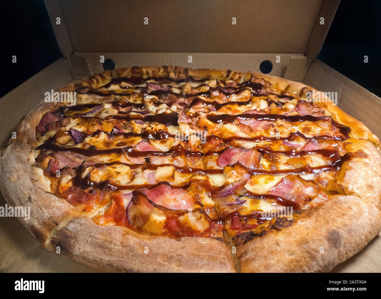 Inside Of A Pizza Box Classic Pizza In A Cardboard Box Wide Angle View From Above Pizza Delivery Menu Fast Food Crusty Dough Stock Photo Alamy